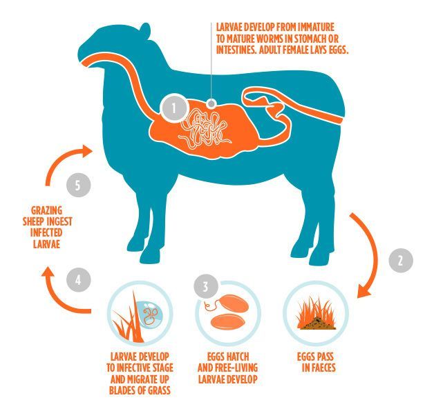 By Jean Duval, agronomist, M.Sc. January 1994 I would like to thank Christiane Trudeau of the McGill University Institute of Parasitology, Jean-Marie Boucher of the Centre d'Agriculture Biologique de la Pocatière and consulting agronomist Caroline Morin for their comments on the text. THE CONTROL OF INTERNAL PARASITES IN RUMINANTS Internal parasites in ruminants constitute a problem that returns periodically in almost all livestock herds. Recourse to synthetic dewormers is only a short-term solution. Animals that graze are always exposed to parasites and are thus constantly being reinfected; not to mention that routine deworming treatments delay the development of immunity in young animals. Moreover, certain parasites have developed a resistance to such deworming products as Benzimidazole, Levamisole and even Ivermectin because of too frequent use. Studies in New Zealand and Ireland indicate among other things that dewormers slow the decomposition of manure. A serious pest control program in organic farming begins with a good understanding of parasites and the implementation of preventive measures. The ultimate objective is to develop an animal production system where parasites may be present in small numbers but do not affect the health or performance of herds. Deworming treatments, whether administered using natural products or not, should therefore only be employed in emergency situations or, if using weaker products, as preventive maintenance. This document provides a description of internal parasites, methods to prevent their infestation and alternatives to conventional dewormers for ruminants. The section on botanical dewormers also includes information on other farm animals (pigs and poultry). GENERAL INFORMATION LIFE CYCLE OF PARASITES Knowledge of the life cycle and characteristics of parasitic worms is essential for anyone wishing to reduce their use of dewormers. Figure 1 shows the direct life cycle common to most parasites. Some parasites however have an indirect cycle, which involves a host animal. For example, the liver fluke (Fasciola sp.) spends part of its life in certain snail species before infecting ruminants. Table 1 presents the main classes of internal parasites, whereas Table 2 provides a list of the main internal parasites of ruminants and their characteristics. Internal parasites are most often worms (helminths) but can also be protozoa, which will not be covered here. Worms are generally specific to one organ, such as the abomasum, duodenum, and lungs. 1. Parasite-infested animal harbours adult worms... 2. The eggs produced by the female are deposited in pastures with fecal matter... 3. They develop into various larvae stages. 4. Animal is contaminated by absorbing L3 larvae or infesting larvae with the grass. 5. The larvae make their way to the alimentary canal where they develop and produce a new generation of adult male or female parasites. Figure 1 . Life cycle of internal parasites in ruminants Source: Rivard et Huneault (1992) Table 1 - Major classes of internal parasites ROUNDWORMS or NemathelminthesStrongyles Gastrointestinal worms Abomasum worms: Haemonchus, Trichostrongylus, OstertagiaDuodenum worms: Trichostrongylus, Nematodirus, Cooperia, StrongyloidesLarge intestine worms: Oesophagostomum, TrichurisSmall intestine worms or Ancylostomidae (hookworm): Ancylostoma, Necator, Bunostomum Lungworm or metastrongyles: Dictyocaulus, Metastrongylus, ProtostrongylusAscarids: Ascaris (duodenum) FLATWORMS or platyhelminthesCestodes (tapeworm): Taenia, Echinococcus, Moniezia (duodenum)Trematodes: Fasciola, Dicrocoelium (liver) Table 2 - Characteristics of main internal parasite genera in cattle, sheep and goats ParasiteDescriptionInfected OrganLife CycleSymptomsHaemonchusM: 10-20 mm red F: 18-30 mm red and whiteAbomasumIS: 4-6 days PP: 3 weeksAnemia, soft swelling under jaw and abdomen, weakness, no weight gainOstertagiaM: 6-9 mm, brown F: 8-12 mmAbomasumIS: 4-6 days PP: 3 weeksSame as Haemonchus and also lack of appetite, diarrheaTrichostrongylusM: 4-5.5 mm F: 5-7 mm light brownAbomasum, duodenumIS: 3-4 days PP: 2-3 weeksSame as Haemonchus and also diarrhea and weight lossCooperiared M: 5-7 mm F: 6-9 mmDuodenumIS: 5-6 days PP: 15-20 daysSame as HaemonchusBunostomum10-30 mmDuodenumIS: ? PP: 30-56 daysEdema, anemia, weight loss, diarrheaStrongyloides (young animals)4-6 mmSmall intestineIS: 1-2 days PP: 8-14 daysAnorexia, enteritis, diarrheaChabertiaM: 13-14 mm F: 17-20 mmLarge intestineIS: 5-6 days PP: 42 daysAnemia, diarrhea with bloodOesophagostomumM: 12-17 mm F: 15-22 mmLarge intestineIS: 6-7 days PP: 41-45 daysDark green diarrhea edemaProtostrongylusM: 16-28 mm F: 25-35 mmLungsIS: 12-14 days PP: 30-37 daysPneumoniaDictyocaulusM: 30-80 mm F: 50-100 mmLungsIS: 6-7 days PP: 3-4 weeksSticky nasal discharge, difficulty breathing, cough Legend: M = Males; F = Females; IS = Infectious stage: minimum number of days for parasite to reach infectious larvae stage (L3) after hatching of eggs; PP = Prepatent stage: period up to appearance of first eggs in dung after host is infected. ROLE OF PARASITES One may ask what the role of internal parasites is in nature. Do they reduce populations that are too large for the resources available? Overpopulation is often, if not always, inherent to agriculture. Or do parasites serve to cull the weaker animals, thus reinforcing a species' chances for survival? This is doubtful since it is generally not to the parasite's advantage to kill its host. Whatever the case, it is normal in nature to find internal parasites in animals. In a natural setting, ruminants, although in herds, are constantly moving from one grazing area to another. It is therefore rare that the soil and grasses they eat are highly contaminated. Since levels of infestation are rarely excessive, animals have a chance to develop immunity. The levels of infestation in goats and sheep that are raised in fairly natural settings tend to fluctuate with seasonal metabolisms w