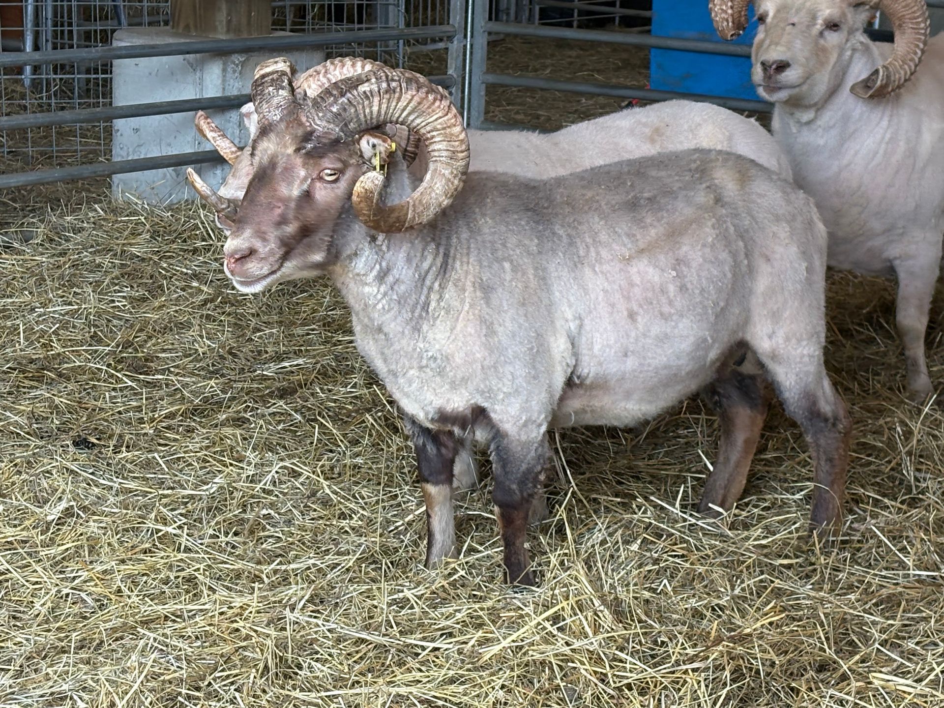 Twin, moorit SGGM ram. Very handsome. Good body length and overall muscling. Comes from one of our favorite ewe lines. AI genetics are 80% with main AI lines from Blettur, Jonas, Throttur, Vali, Kveikur, Drifandi. Beautiful wool. Even temperament.