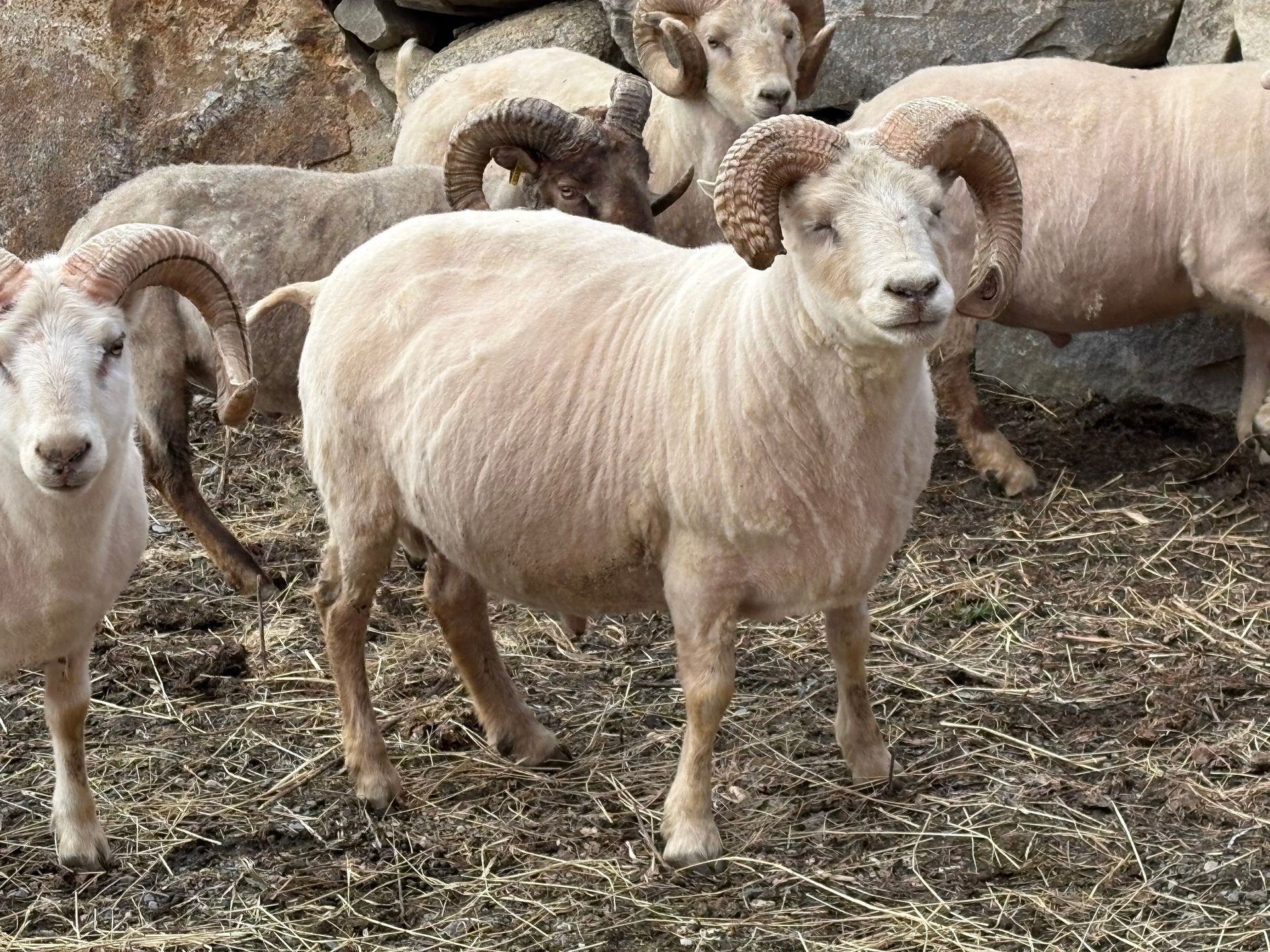 Single AI heterozygous white ram. Out of AI sire Koggull. Mom is very milky and attentive. Excellent growth rate as a lamb. 72% AI genetics from these sires: Kogull, Eldar, Grimu, Noi, Blettur, Fengur, Bruni, Stubbur, Horvi, Bambi, Morro, Hynkill, Heli and more from the dam. This is a very large ram. Plentiful wool. Excellent horns.